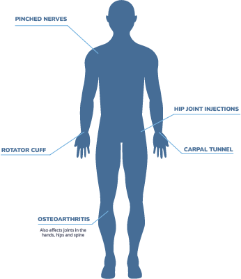 Ultrasound-guided injection treatments provide many patients with relief at the target site from many degenerative disease conditions as well as from soft tissue disorders and sports or accidental injuries, including: