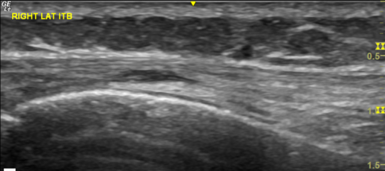 Diagnostic ultrasound is very helpful for assessment of iliotibial band friction syndrome. As this is a dynamic modality we we will be able to see the IT band as it moves over the lateral epicondyle of the knee during extension and flexion of the knee. This allows us to evaluate for any thickening of the ITB but also to identify any iliotibial bursitis which is indicated by fluid in the iliotibial bursa.
